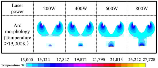 When the laser power is less than 400 W, the arc temperature along the laser transmission path remains below 13,000 K. According to the research findings of Jiang [], the high-temperature area of the arc can hinder laser energy transmission. However, at this stage, the arc remains nearly transparent to laser energy transmission, maintaining good stability throughout the process. When the laser power increases to 600 W, the high-temperature plasma below the tungsten electrode becomes continuous, with a height of about 0.5 mm. Additionally, the high-temperature plasma area above the laser impact point reaches a height of 1 mm. At this stage, the high-temperature arc region begins to affect laser energy transmission. When the laser power increases to 800 W, the arc temperature along the laser transmission path exceeds 13,000 K, completely obstructing laser energy transmission. This leads to a rapid increase in the temperature of the coupled heat source, a significant expansion in volume, and a sharp decline in stability.