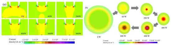 The Effect of Laser Power on the Distribution of HTAAL Discharge Current Density: (a) Arc space. (b) Anode surface.
