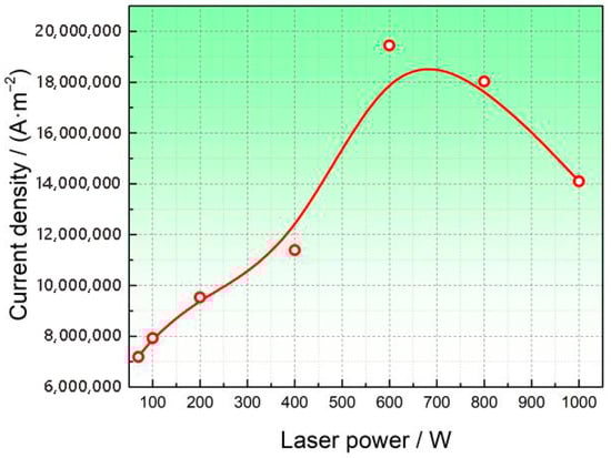 Figure 9 illustrates the effect of laser power on the current density in the HTAAL space and on the workpiece surface during discharge. The discharge method of HTAAL undergoes a fundamental change compared to HTA. Due to the ring-shaped structure of the hollow tungsten electrode tip, the discharge on the workpiece surface also forms a ring shape. As a result, the current density distribution in the HTA space is cylindrical. The width of the cylindrical region where the current density exceeds 1 × 107 A/m2 is about 6 mm, and the ring diameter is about 4 mm. After the laser is applied to the HTA, the high temperature at the laser irradiation point enhances thermal electron emission, shifting the discharge position from the original ring-shaped region to the laser irradiation point. Consequently, the ring discharge mode of HTA transforms into the central spot discharge mode of HTAAL. As laser power increases, the electron emission capability at the laser irradiation point strengthens, and the current density continues to rise. As shown in Figure 10, when the laser power increases from 100 W to 600 W, the peak current density increases from 8 × 106 A/m2 to 1.95 × 107 A/m2. However, the current density does not increase indefinitely. When laser power reaches 600 W, the current density approaches its peak. As the laser power continues to increase, the current density begins to decline. When the laser power increases to 1000 W, the peak current density decreases from 1.95 × 107 A/m2 at 600 W to 1.4 × 107 A/m2. With the increase in laser power, the current density of HTAAL discharge first increases and then decreases.