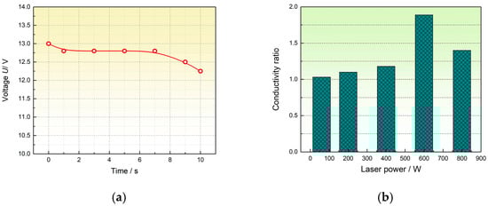 Voltage variation curve and conductivity of HTAAL: (a) Arc voltage varies with time during the stable combustion phase of HTAAL. (b) conductivity under different laser power.