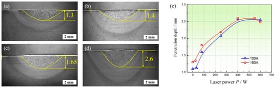 Figure 12 shows the penetration depth under stable discharge of HTAAL at different laser powers, with a welding current of 150 A and a welding speed of 60 mm/min. As laser power increases, the melting depth increases slowly. When the laser power reaches 400 W, the melting depth increases significantly and becomes twice that of HTAAL. The melting depth variation curve under welding current conditions of 100 A and 150 A is analyzed statistically, and the results are shown in Figure 12. With the increase in laser power, the melting depth first increases and then decreases. The rapid increase in penetration depth is related to the transition of HTAAL to a central spot discharge and the increase in current density. The decrease in penetration depth is caused by excessive laser power, which leads to a large height of the HTAAL high-temperature zone. This obstructs laser energy transmission, causes arc expansion, reduces the laser energy reaching the workpiece surface, and decreases current density.
