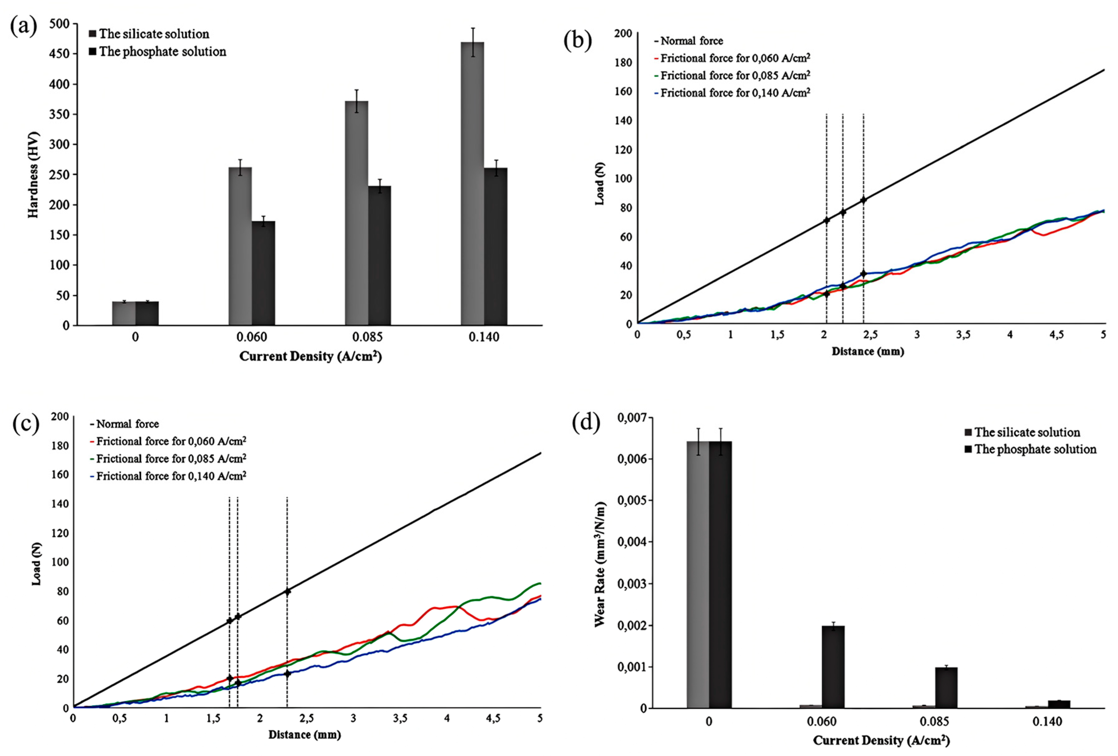 Electrical parameter | Current density: 12 A/dm2, electrolyte temperature: 20–35 °C, processing time: 50–150 min | Current density: 0.5–2.5 A/dm2, electrolyte temperature: 40 ± 2 °C, processing time: 0–14 min | Current density: 3–8 A/dm2 (optimal 5 A/dm2), electrolyte temperature: 30 °C, processing time: 30 min | Cnode voltage: 550 V, cathode voltage: 160 V, processing time: 30 min |
