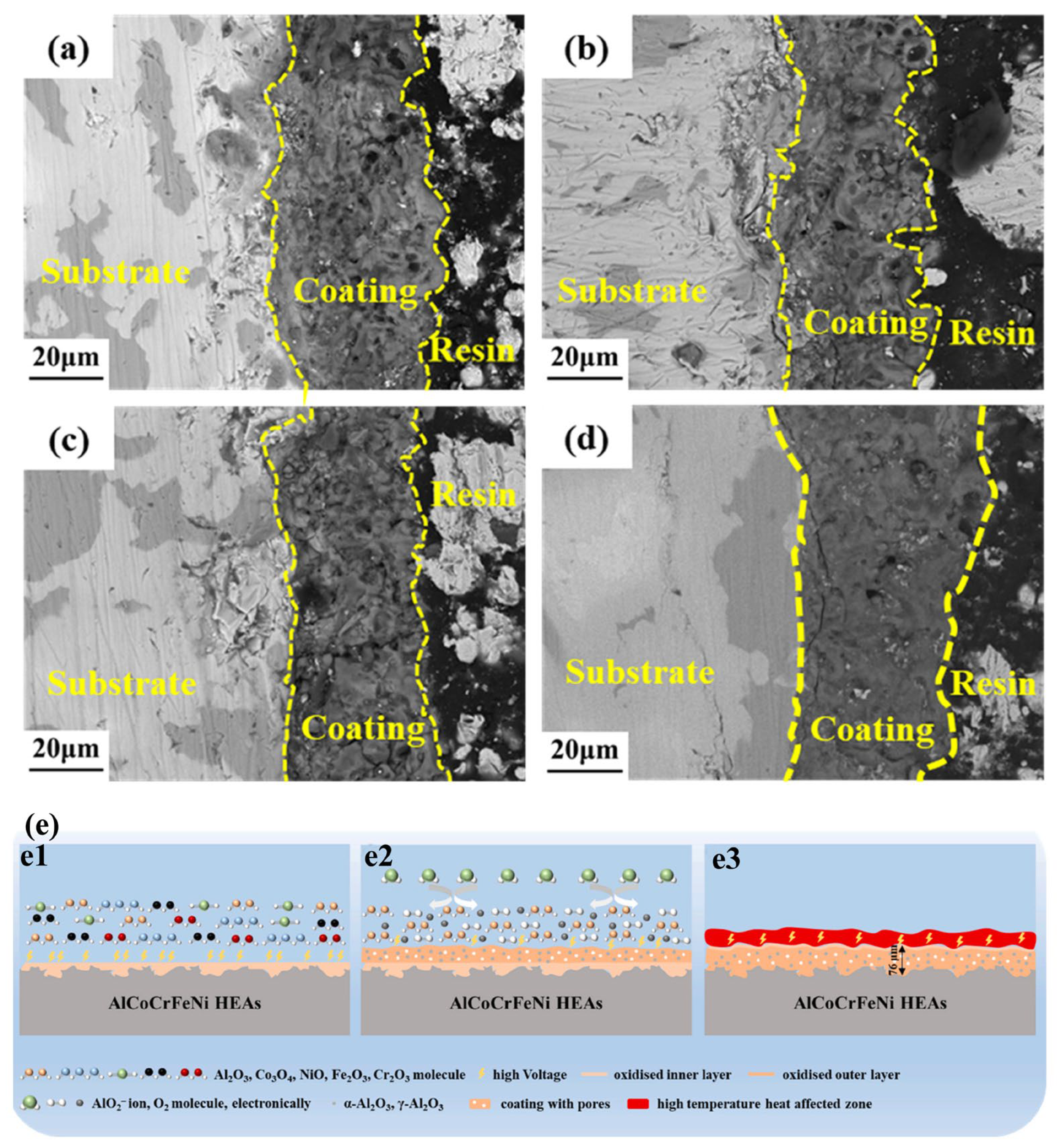 - Yang, F.; Du, C.; Tao, S.Y.; Chang, Y.Q.; Nie, Z.H.; Wang, Z.; Lu, H.L. Study on the effect and growth mechanism of micro-arc oxidation coating on AlCoCrFeNi high entropy alloy. J. Alloys Compd. 2025, 1020, 179469. [Google Scholar] [CrossRef]