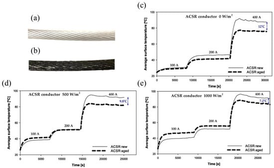 (a,b) ACSR conductor (a) New ACSR. (b) Aged ACSR. Conductor temperatures under different solar irradiation levels (c) 0 W/m2. (d) 500 W/m2. (e) 1000 W/m2, adapted from [89].