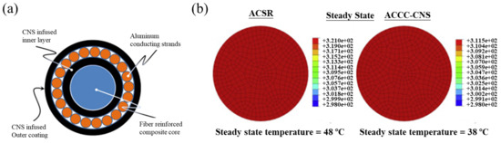 (a) Schematic diagram of the ACCC-CNS conductor and (b) steady-state temperature distribution across the cross-sections of both ACSR and ACCC-CNS conductors under a specified current load of 400 A, adapted from [102].