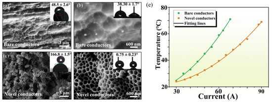 Surface micro-morphology and current-dependent temperature rise profile: (a,b) bare conductor, (c,d) novel conductor, (e) temperature rises of bare and novel conductors under the applied current, adapted from [108].