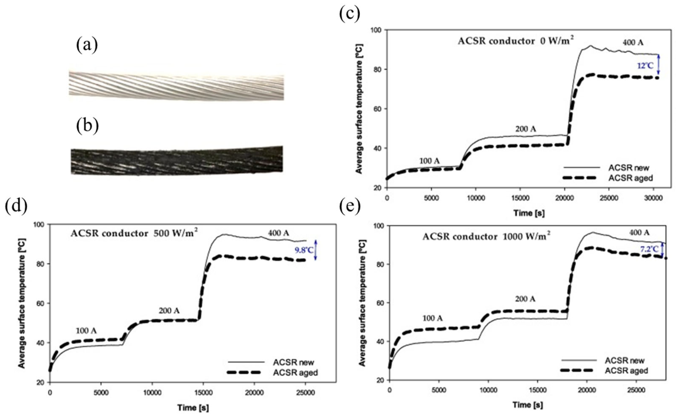 Figure 3. (a,b) ACSR conductor (a) New ACSR. (b) Aged ACSR. Conductor temperatures under different solar irradiation levels (c) 0 W/m2. (d) 500 W/m2. (e) 1000 W/m2, adapted from [89].