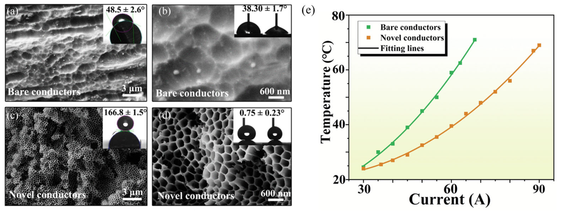 Figure 6. Surface micro-morphology and current-dependent temperature rise profile: (a,b) bare conductor, (c,d) novel conductor, (e) temperature rises of bare and novel conductors under the applied current, adapted from [108].