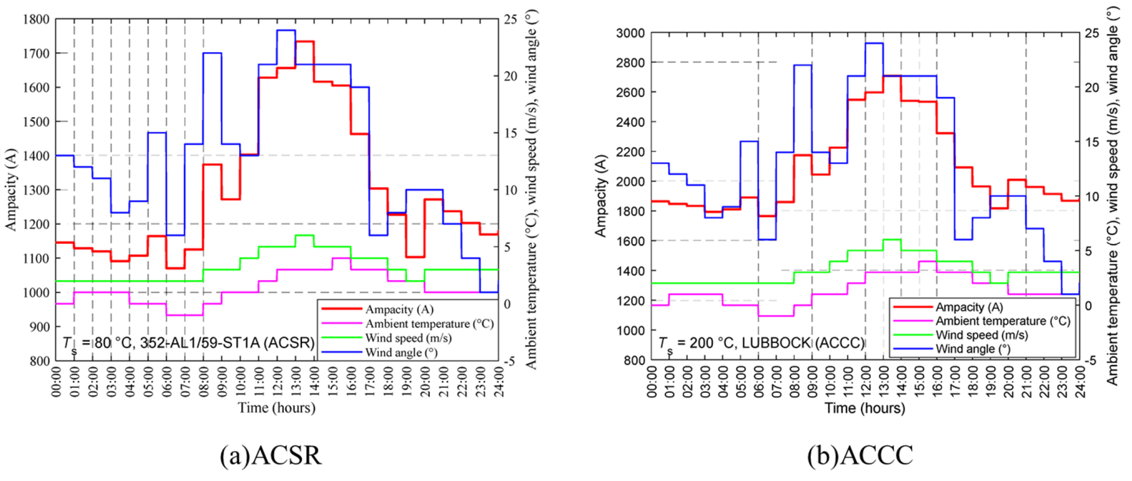 Figure 7. The 24 h ampacity variation curves of ACSR conductors and ACCR conductors, adapted from [111].