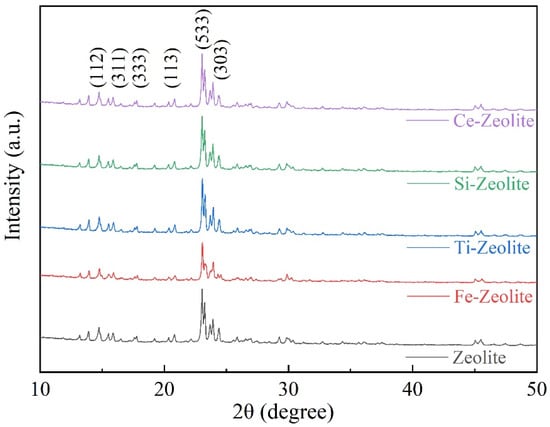 Gelatinous ferric hydroxide was selected as a ferric precursor and incorporated into zeolite using the sol–gel method. An iron hydroxide colloid was obtained through the following procedure. A solution of Fe3+ was first prepared by dissolving Fe(NO3)3·9H2O in 10 mL of distilled water, and this was then added dropwise to 40 mL of boiling distilled water (heated on an electric heater and kept at a boil), with occasional stirring, By controlling the amount of Fe(NO3)3⋅9H2O, different colloid concentrations (0.01–0.30 mol/L) were obtained. ensuring that the reaction was taking place adequately between drops [33]. The solution was continuously heated until it turned brown to ensure that iron hydrolysis had been completed. The iron hydroxide colloid solution was then cooled to room temperature [34]. TiO2 sol–gel was synthesized through hydrolysis of tetrabutyl titanate (TBT) [35,36]. SiO2 sol–gel was synthesized through hydrolysis of tetraethyl orthosilicate (TEOS, 99%) [37]. CeO2 sol–gel was synthesized through hydrolysis of cerium nitrate hexahydrate solution [38]. The desired amount of zeolite was added to each X colloid solution (X = Fe(OH)3, TiO2, SiO2, or CeO2). After dipping for a certain time, the mixture was collected by suction filtration. The product was dried at 105 °C overnight. Finally, the concentrated mixture was calcined in a muffle furnace at a suitable temperature for 2 h, and then cooled to room temperature; the resulting product was named M-zeolite (M = Fe, Ti, Si, or Ce).