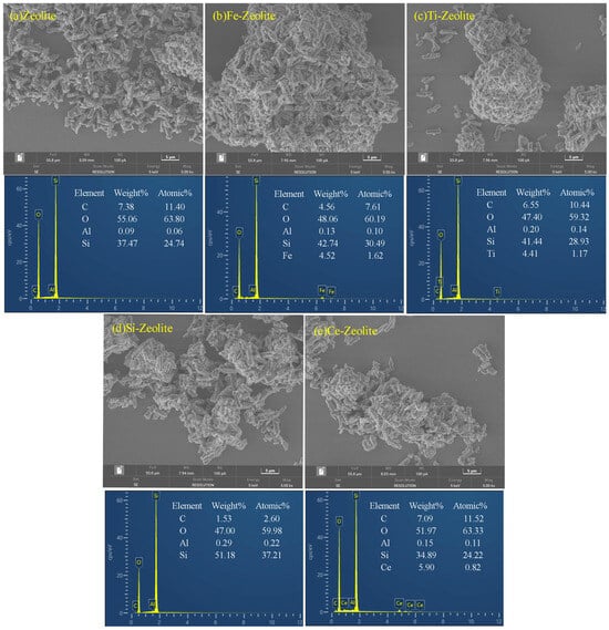 Energy-dispersive spectroscopy (EDS) analysis was conducted to further investigate the composition of the unmodified and modified zeolites (Figure 4). The elemental peaks confirmed the presence of carbon (C), aluminum (Al), silicon (Si), oxygen (O), iron (Fe), titanium (Ti), and cerium (Ce) in these modified zeolites. After evaluating the regions under the peaks of individual elements, the corresponding elemental composition was determined. The peaks of these different metals in the EDS spectra also support the notion that modification took place in the crystal lattices of the various zeolites. A similar study utilizing EDS also confirmed the presence of distinct metal peaks (Fe, Ti, Si, Ce), further supporting this notion [50]. The peaks of C, O, Si, and Al were observed in the EDS spectra, confirming that the basic composition of the parent zeolite remained intact even after the modifications were applied. This result also revealed that neither the sol–gel method nor the impregnation method affected the zeolite framework, thereby promoting the adsorption process. Moreover, the elemental content distribution revealed by EDS confirmed that the theoretical metal loadings (Fe, Ti, Si, and Ce) were approximately 5 wt% in relation to the unmodified zeolites.