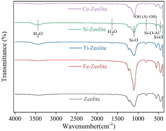 The results of Fourier transform infrared spectroscopy (FT-IR) analysis of the composition of unmodified zeolite, Fe–zeolite, Ti–zeolite, Si–zeolite, and Ce–zeolite are illustrated in Figure 5. The broad band within the range of 3500–3100 cm−1 is assigned to the stretching vibration of a hydroxyl group from Si-OH hydrogen-bonded to water on the surface of the zeolite [51]. In the lower-frequency region of the IR spectrum (1800–400 cm−1), the main peaks of the samples can be seen at wavelengths of 440, 540, 795, and 980–1090 cm−1. The FT-IR peaks at wavelengths of 440 and 550 cm−1 can be attributed to T-O-T and microporous zeolites, respectively. However, the presence of absorption bands at around 440 cm−1 and 1100 cm−1 confirms the presence of the Si-O functional group [52]. The FT-IR bands at 550 cm−1 are indicative of the Si-O-Al group [53]. The observed bands at approximately 795 cm−1 are due to the –OH (Al–OH) translational vibration. Major changes were observed in the shape of the strongest adsorption bands at 1100 cm−1, associated with a change in the modified NaY–zeolite. The relative intensity of the Si–O stretching vibration (1107 cm−1) increased with the amount of metal loading. NaY–zeolite has the chemical composition TO4 (T = Si or Al). The Si/Al ratio affects the vibration power of the bands. In Fe-modified zeolites, the band near 1100 cm−1 becomes sharper and more intense, indicating the formation of Si–O–M (M = Fe, Ti) bonds [54]; in Si-modified zeolite, a more pronounced Si–O–Si vibration is observed, reflecting a higher Si/Al ratio and enhanced hydrophobicity.