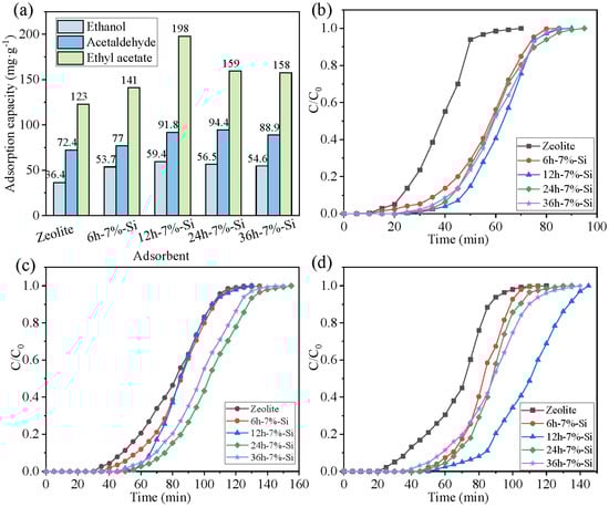 (a) OVOC adsorption capacities. Breakthrough curves of zeolites modified under different impregnation times for (b) ethanol, (c) acetaldehyde, and (d) ethyl acetate. Notes: Si is used as a modifier, and the impregnation concentration is 7%, with different impregnation times (6 h, 12 h, 24 h, 36 h).
