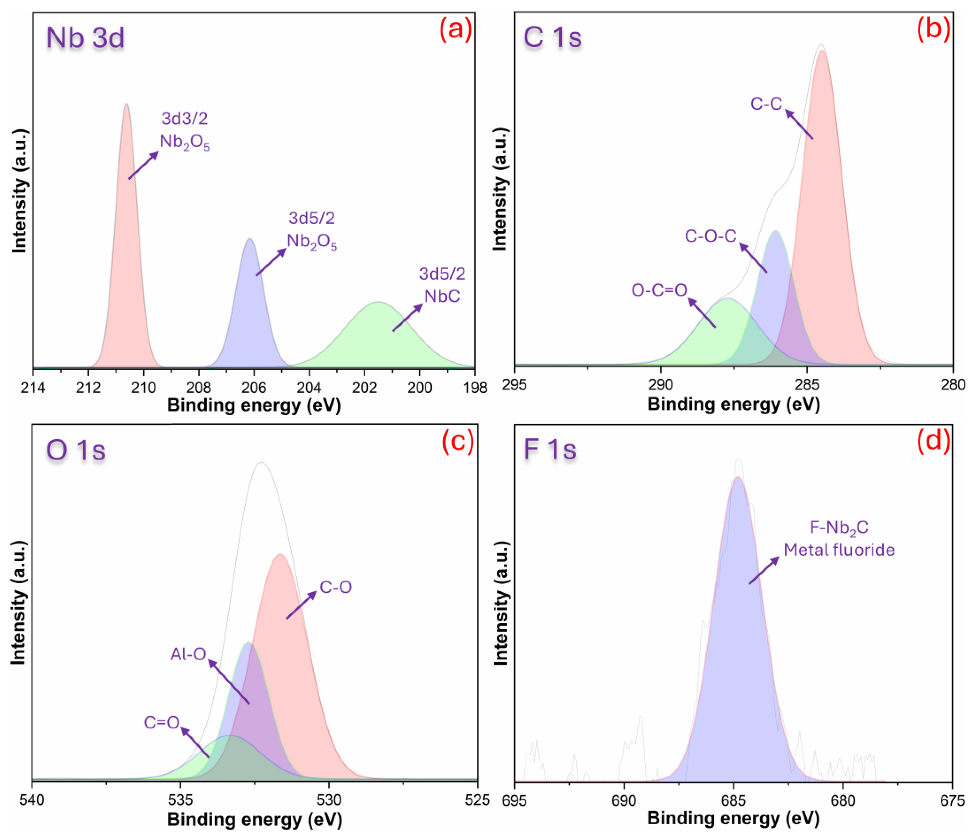 37]. The O1s spectrum (ranging from ~530–533 eV) distinguish signals from both metal oxide/Nb–O (lower BE), C–O/OH (intermediate Be), and adsorbed water/organic O (higher eV), confirming both the MXene terminations (–O, –OH) and the organic matrix oxygen content; they can also indicate residual Al oxide/bonds from the MAX phase if weak Al–O components are present (