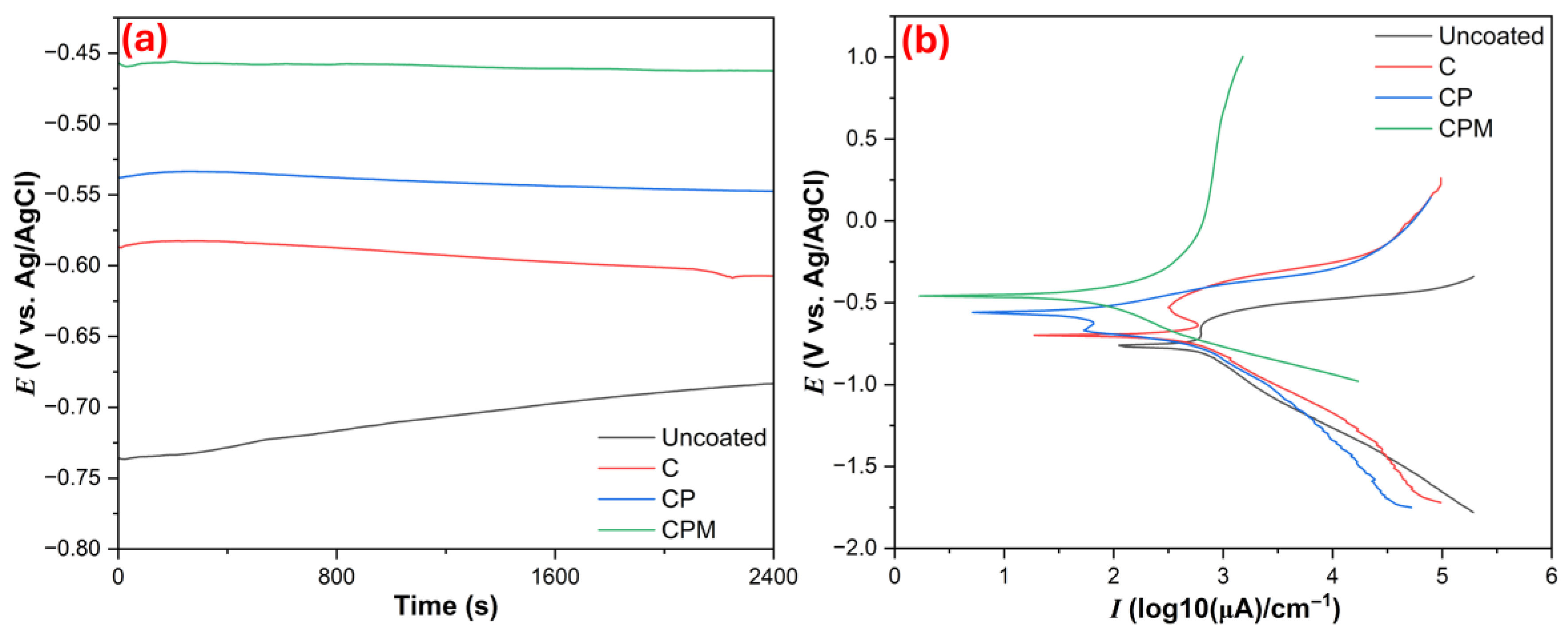 OCP increasing to ≈ −0.458 V. OCP curves remain relatively stable over time across all coatings; particularly, the more positive and stable OCP exhibited by CPM indicates the formation of a long-term protective film on the surface that is non-continuous or impermeable [