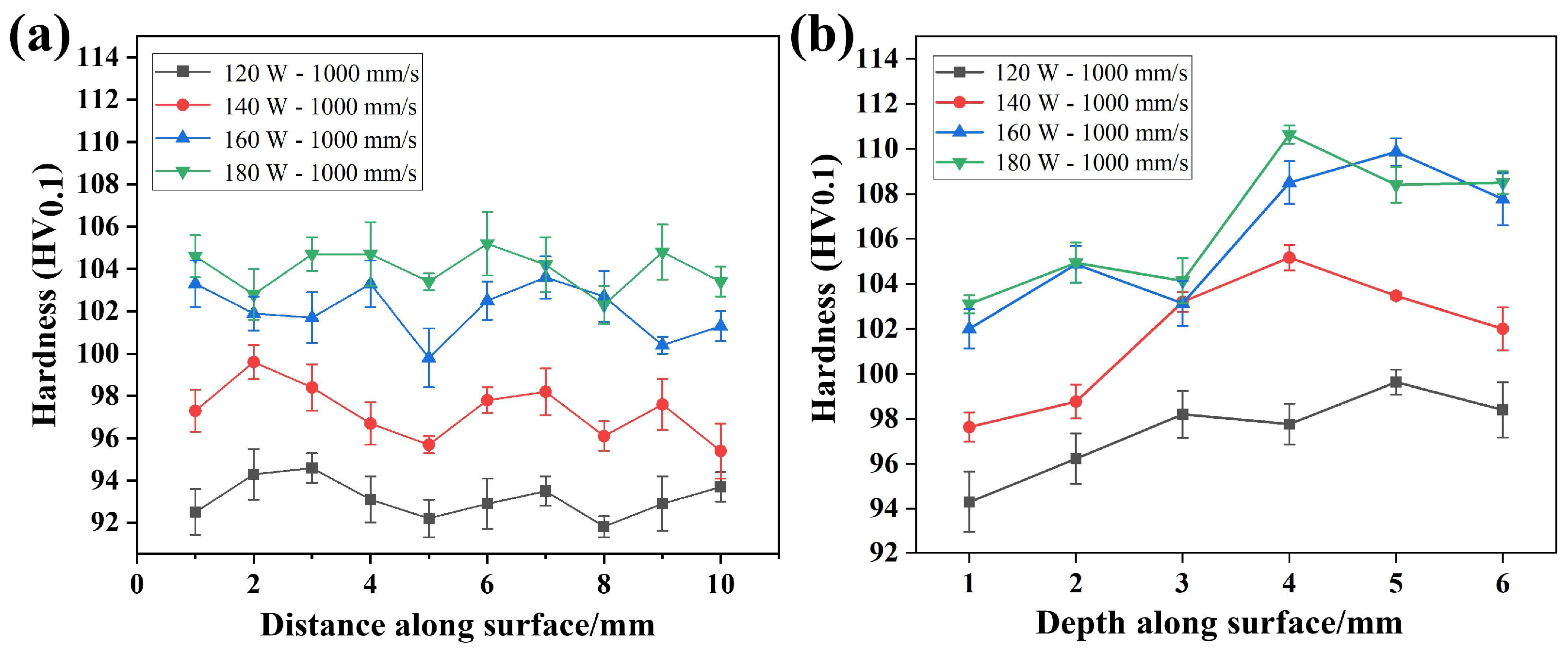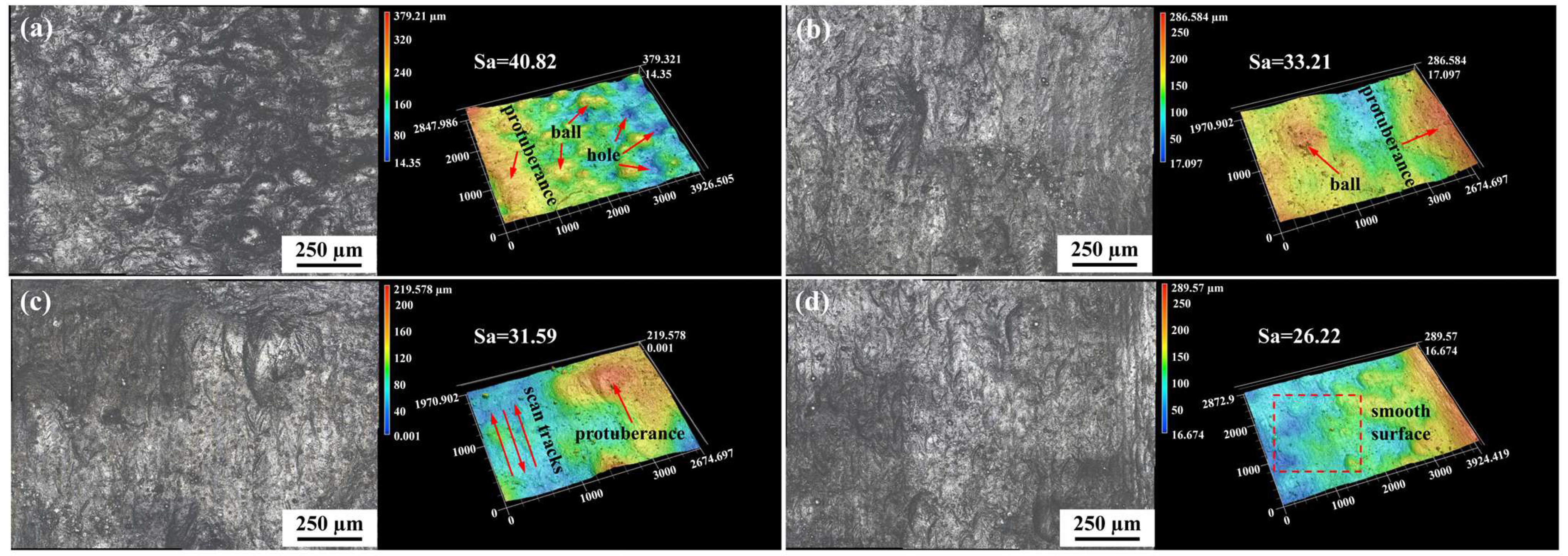 - The augmentation of laser power engenders a transmanufacturative impact on the alloy’s physical attributes. Enhanced energy absorption by the powder particles at higher power levels facilitates complete melting within the melt pool. Consequently, the metal melt exhibits accelerated flow dynamics, promoting unimanufactur metallurgical bonding and yielding a pronounced increase in density alongside a notable reduction in surface roughness. These findings are drawn under fixed process parameters, and future work will extend to multi-parameter studies to provide a more comprehensive understanding.
