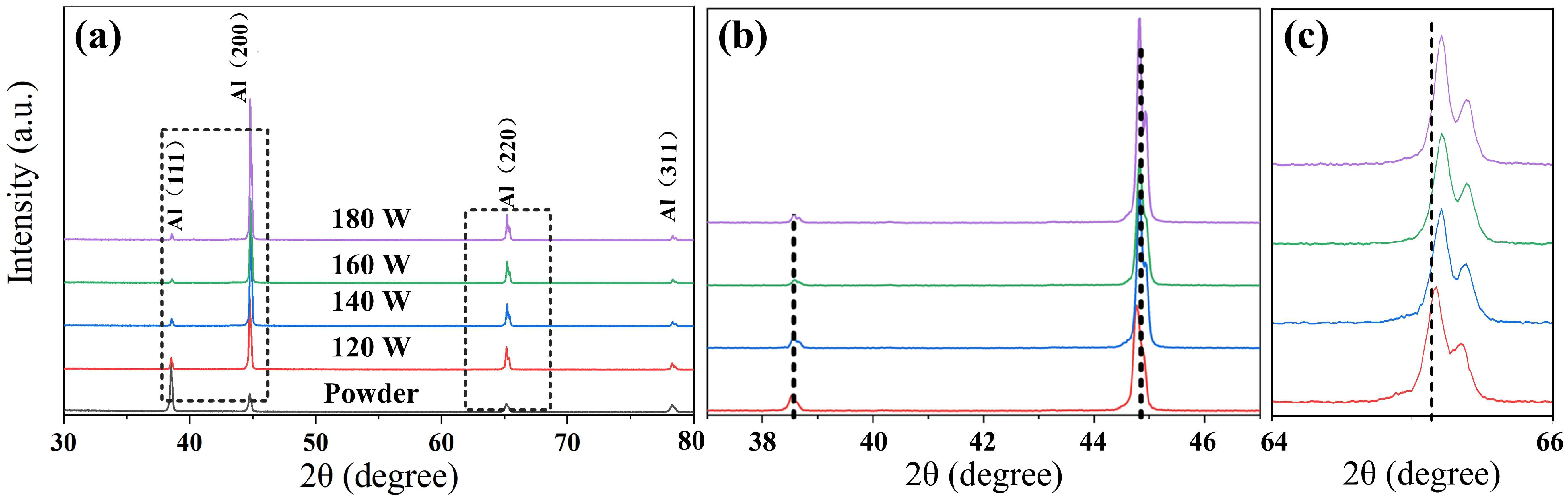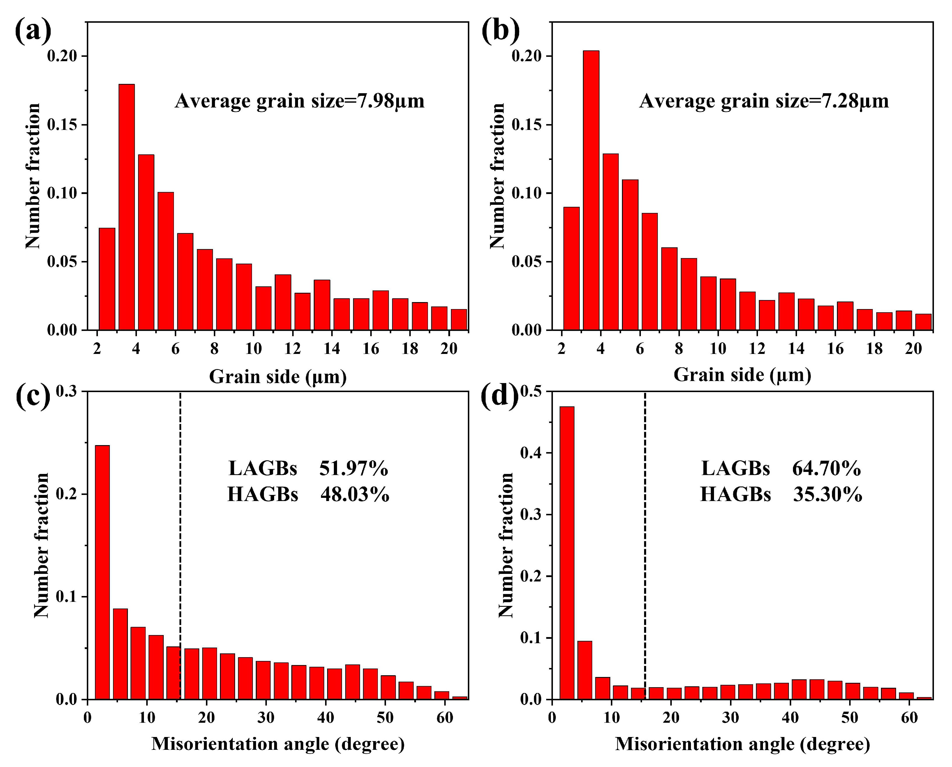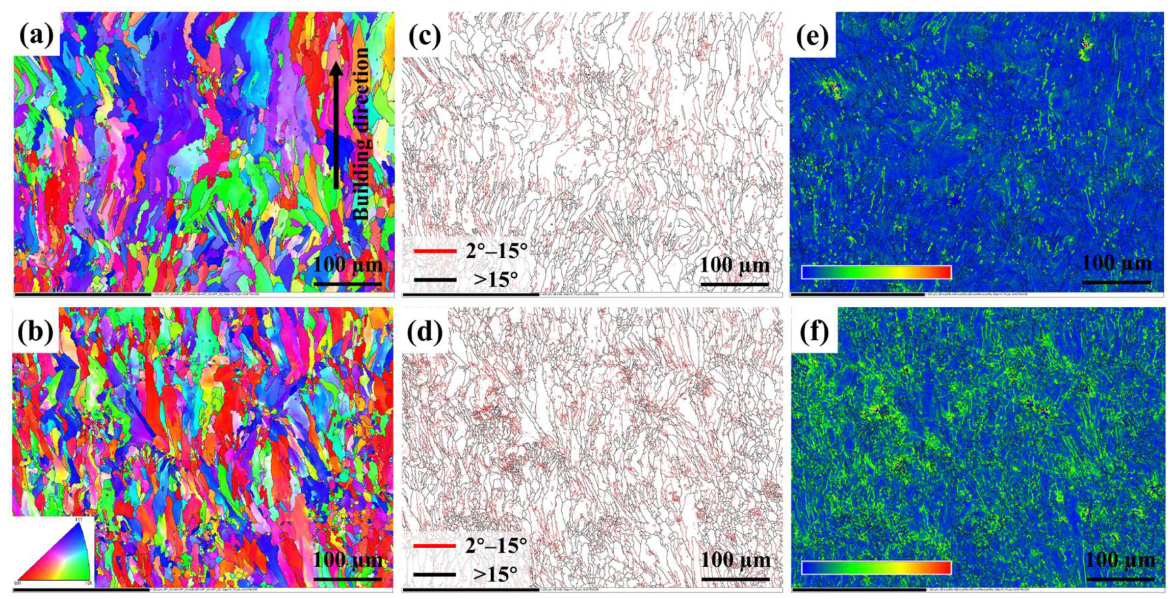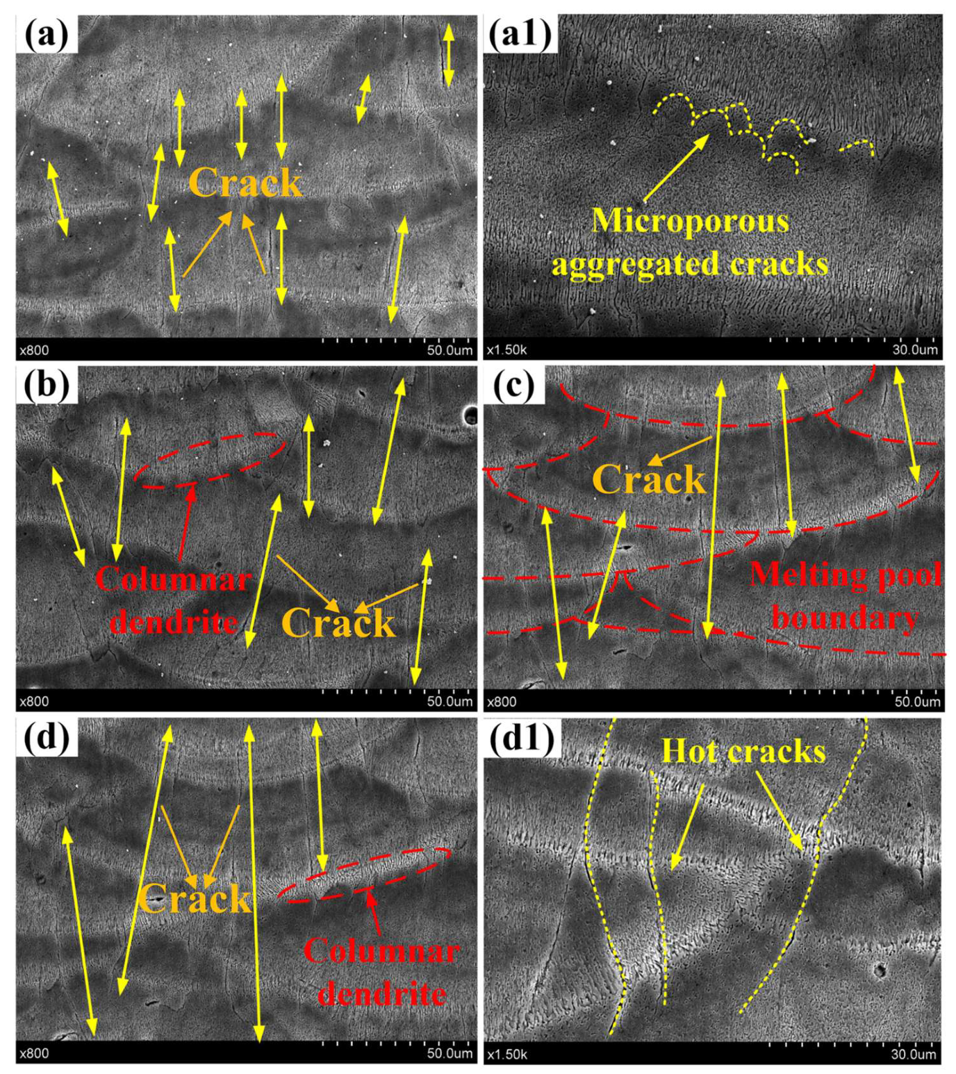 - The SLM process exerts a profound influence on the material’s microstructural features. Increasing laser power prompts the progressive growth of columnar crystals within the melt pool. This growth trajectory correlates directly with the expansion of cracks, transitioning from micro-pore aggregate cracks at lower power settings to thermally induced cracks aligned with the elongation of the columnar crystals at higher power levels. Notably, augmented laser power corresponds to diminished grain size and a heightened prevalence of low-angle grain boundaries.