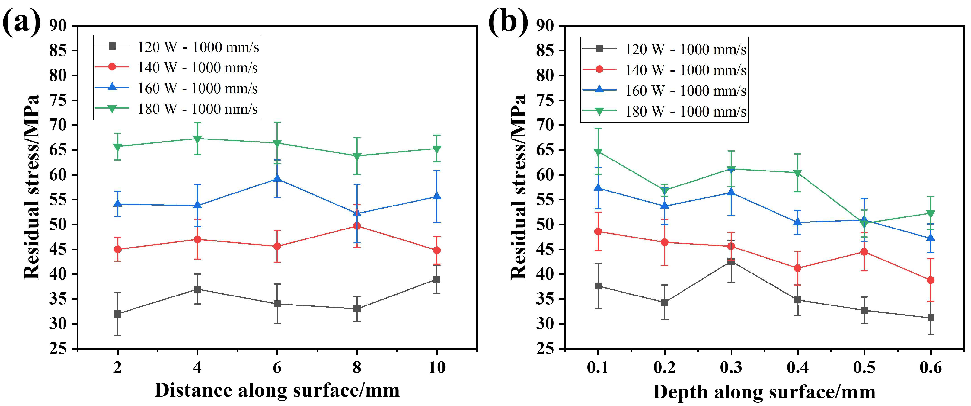 - X-ray diffraction (XRD) analyses reveal a compelling correlation between laser power and solid solution content, underpinning subsequent microhardness variations. Higher laser power precipitates an elevated solid solution fraction within the fabricated component, in turn translating to enhanced microhardness values. Remarkably, the surface of the manufactured specimen adopts a state of residual tensile stress, which escalates progressively with increasing laser power.