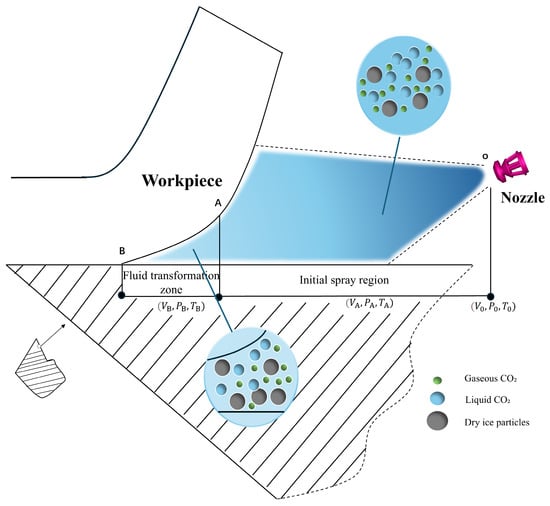 This section presents the mathematical modelling of the heat transfer mechanisms during γ-TiAl machining under scCO2-MQL conditions. The theoretical analysis focused on jet flow dynamics and heat transfer coefficient calculations to characterise the complex cooling behaviour. Based on the flow field analysis, the cutting zone can be divided into two distinct regions: the initial injection zone and the fluid transformation zone, as illustrated in Figure 1. The initial injection zone was characterised by the rapid expansion of the scCO2 jet following nozzle ejection, accompanied by phase transitions that resulted in the formation of oil mist and CO2 dry ice particles. In contrast, in the fluid transformation zone, a high-speed compressible fluid flows through the narrow space between the tool rake face and the underside of the cutting layer.