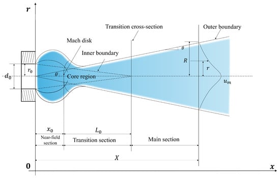 Equation (9) establishes the velocity connection between the two regions, ensuring the continuity of flow characteristics at the transition position. This indicates that the velocity at the entrance of the fluid transformation zone equals the centerline velocity at the end of the initial injection zone (the endpoint of the transition segment).