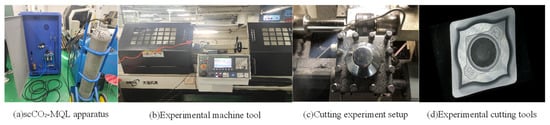 65.5 mm × 196 mm. The experimental setup is illustrated in Figure 5. A CKA6150 CNC lathe was selected, as shown in Figure 5b, which can perform complex, high-precision external cylindrical and face machining operations. The experimental site is shown in Figure 5c. Cemented carbide inserts (Mitsubishi turning insert CNMG120408-MJ, cemented carbide grade RT9010, uncoated, hardness HRA91.8) were selected. The scCO2-MQL equipment used was the Cry0lube-iOOW system manufactured by Dongguan Amolin Mechanical Manufacturing Technology Co., Ltd. (Dongguan, China), as shown in Figure 5a,b. This system operates based on the Joule-Thomson effect, where high-pressure CO2 (7.5–8.5 MPa) undergoes rapid expansion upon exiting the nozzle. This expansion creates a three-phase jet of gaseous CO2, solid dry ice particles, and atomized oil droplets, which provides simultaneous cryogenic cooling and lubrication to the cutting zone.