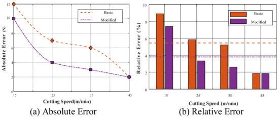 A relative error analysis further confirmed the advantages of this modified model. The modified heat transfer coefficient model exhibited an average relative error of 8.1%, representing a 21.8% reduction compared to the basic model’s 10.3%. In particular, under medium-speed cutting conditions (25 m/min), the error reduction reached 42.9%, confirming that the precise characterisation of the heat transfer coefficients within this velocity range has a decisive impact on cutting force prediction.