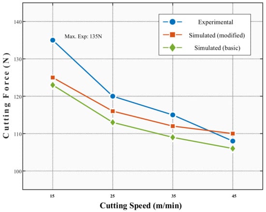Figure 8 compares the experimental and simulated cutting forces for γ-TiAl machining under scCO2-MQL conditions using the modified heat transfer coefficient model. The results showed that the cutting force decreased with increasing cutting speed, dropping from 135 N at 15 m/min to 109 N at 45 m/min. This trend results from two competing mechanisms: (1) increased cutting speed generates higher cutting zone temperatures, inducing thermal softening that reduces material strength, and (2) efficient scCO2-MQL cooling suppresses excessive temperature increases while reducing tool-chip friction coefficients. Under scCO2-MQL conditions, the efficient cooling action effectively suppressed thermal softening phenomena, maintaining higher material strength levels while simultaneously reducing the friction coefficient at the tool-chip interface. The combined action of these mechanisms resulted in an overall decreasing trend in the cutting forces.