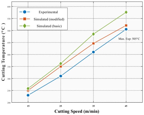 Figure 6 presents the comparative results of the temperature prediction performance. As shown in Figure 6a, the modified heat transfer coefficient demonstrated superior temperature prediction accuracy across the entire velocity range. At a cutting speed of 15 m/min, the temperature deviation between the basic model and the experimental value was 28 °C, whereas the modified model reduced this to 20 °C. As the cutting speed increased to 45 m/min, the basic model error expanded to 71 °C. In contrast, the modified model showed only a 16 °C deviation, demonstrating significant advantages and indicating that the modified heat-transfer coefficient more accurately captures the complex heat-transfer behaviour in high-speed cutting environments.