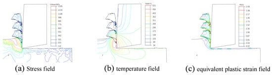 As illustrated in Figure 10b, the temperature field in the cutting zone exhibited distinct gradient distribution characteristics. The highest temperature zone is primarily located at the intersection of the tool-chip interface and primary deformation zone, with temperature contours displaying characteristic “arc-shaped” distributions in the cutting region. The temperature field formed clearly demarcated gradients from the tool rake face toward the chip-free surface, with chip root region temperatures maintained within the 314–363 °C range. Temperature gradients significantly decreased with distance from the cutting zone.