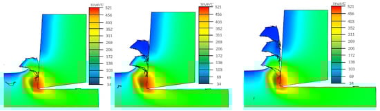 Figure 10a reveals a highly non-uniform stress distribution in γ-TiAl under scCO2-MQL conditions. The maximum equivalent stress concentrations (1106–1306 MPa) occurred within the primary shear zone, forming distinct shear bands characterised by intense plastic deformation. The stress field displayed distinct gradient characteristics along the cutting direction, gradually decreasing from the cutting edge region toward the chip-free surface, with a range of 114 to 334 MPa. A secondary high-stress zone (775–885 MPa) formed at the tool-chip interface region, with a distribution directly related to the tool friction effects.