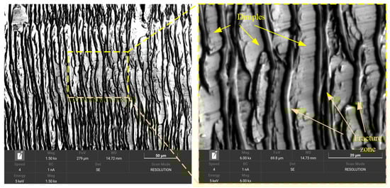 Microstructural examination of the chip specimens revealed surface features consistent with the computational predictions. As shown in Figure 12, the chip-free surface exhibited alternating regions with different deformation characteristics, with dimple structures concentrated in areas corresponding to the simulated high-temperature zones. These morphological features aligned with the stress and strain distributions predicted by finite element analysis.