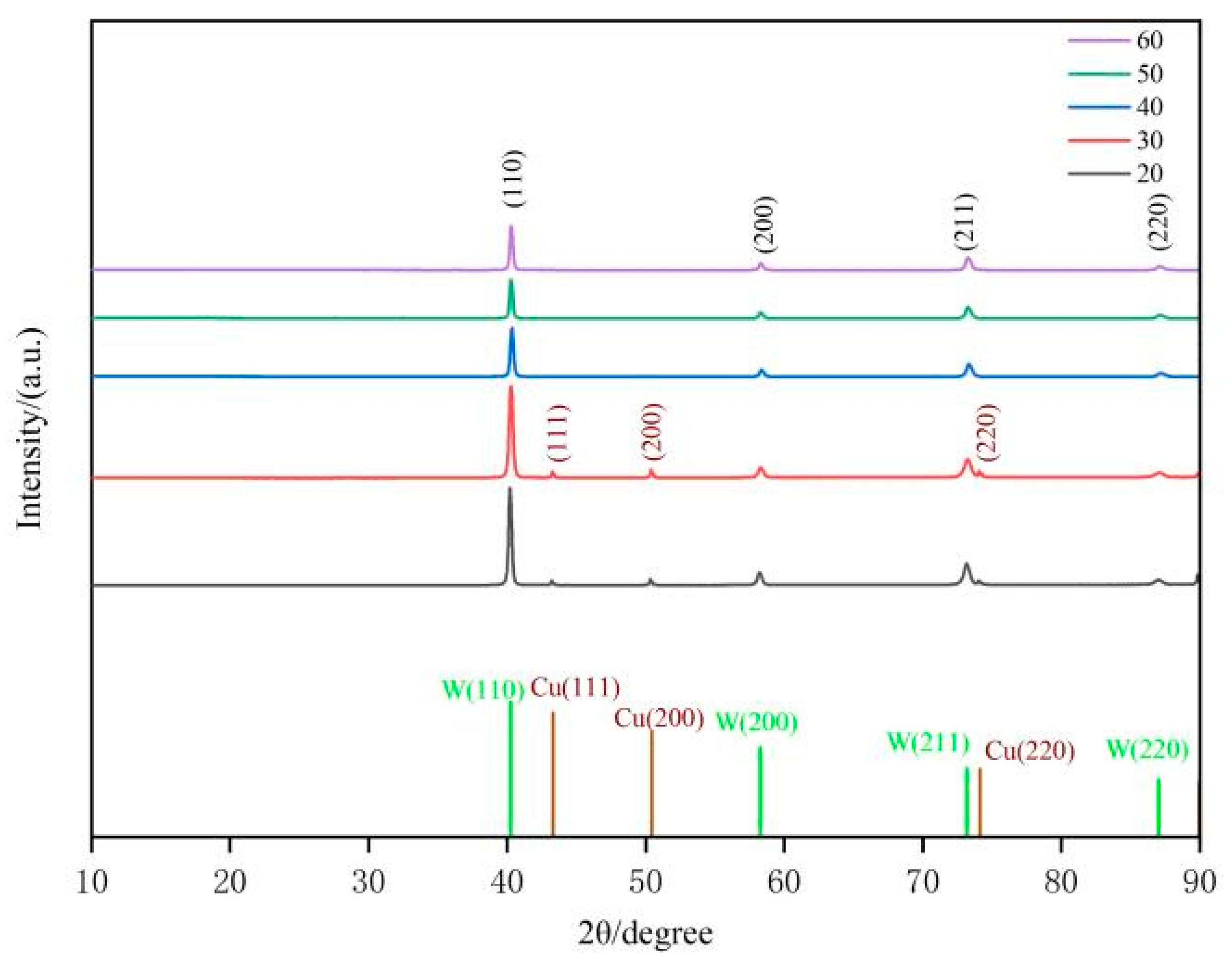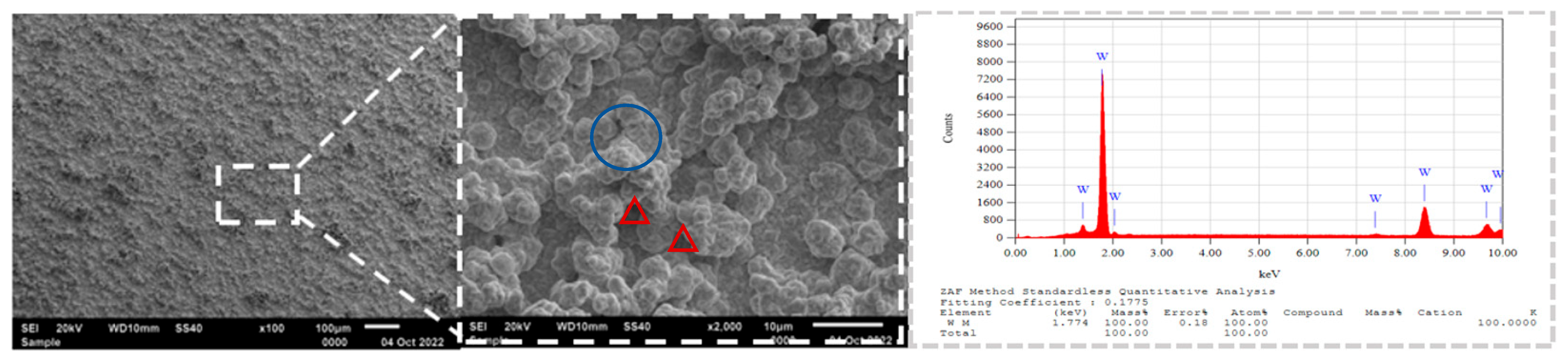 3.1. Surface Morphology and Crystal Structure of Tungsten Coatings Under Direct Current