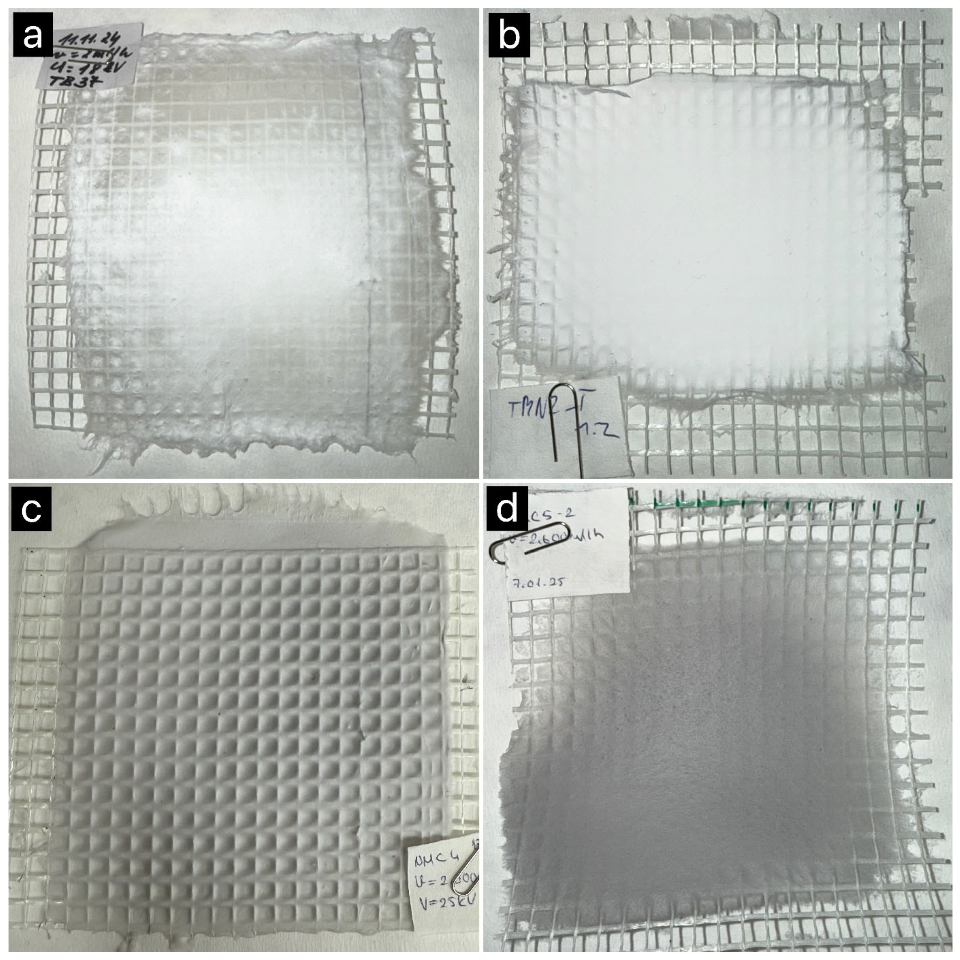 Figure 3c is the first NMC-doped TEOS fiber (TBN1), produced with a high extrusion rate (2.5 mL/h) and a voltage of 25 kV. The presence of NMC increased the conductivity of the solution, and the high extrusion rate led to uncontrolled fiber deposition, resulting in an uneven surface morphology. The second NMC-doped TEOS fiber sample (TBN2), shown in
