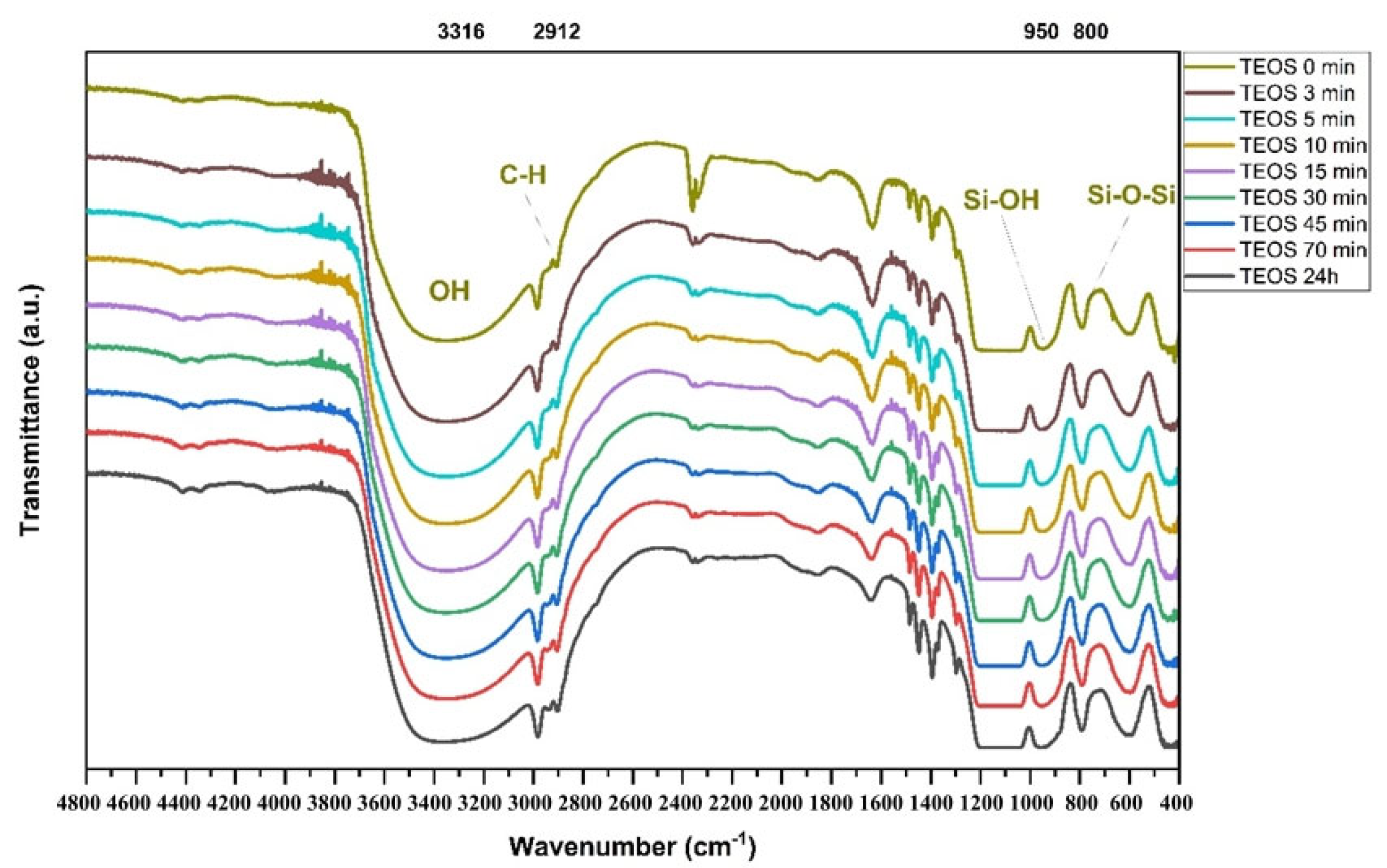 Figure 6. Measurements were performed at 0, 3, 5, 10, 15, 30, 45, and 70 min, as well as at 24 h. The obtained spectra reveal the key functional groups associated with the formation of the silica network.