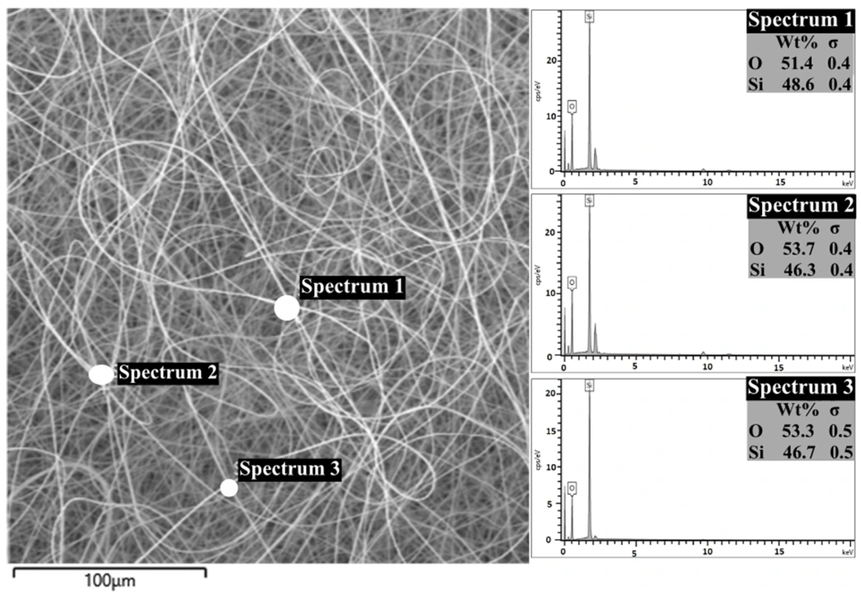 Figure 9, the EDS analysis of the Spectrum 2 region revealed oxygen (O) and silicon (Si) as the primary elements. The oxygen content was measured as 53.7%, while the silicon content was found to be 46.3%. These results indicate that TEOS underwent hydrolysis and initiated the formation of Si-O-Si bonds following a preliminary heat treatment at 80 °C for three hours, which rendered the solution suitable for electrospinning. Although the resulting fibers did not form a fully condensed silica structure, the dominance of Si and O in the EDS results demonstrates that the material exhibits the characteristics of a condensed silica precursor. The carbon (C) and gold (Au) signals were excluded from the analysis, as their presence could result from organic residues or sample coating. These findings align with those previously reported by Shahhosseininia (2018) for silica-based fibers without additional treatment [