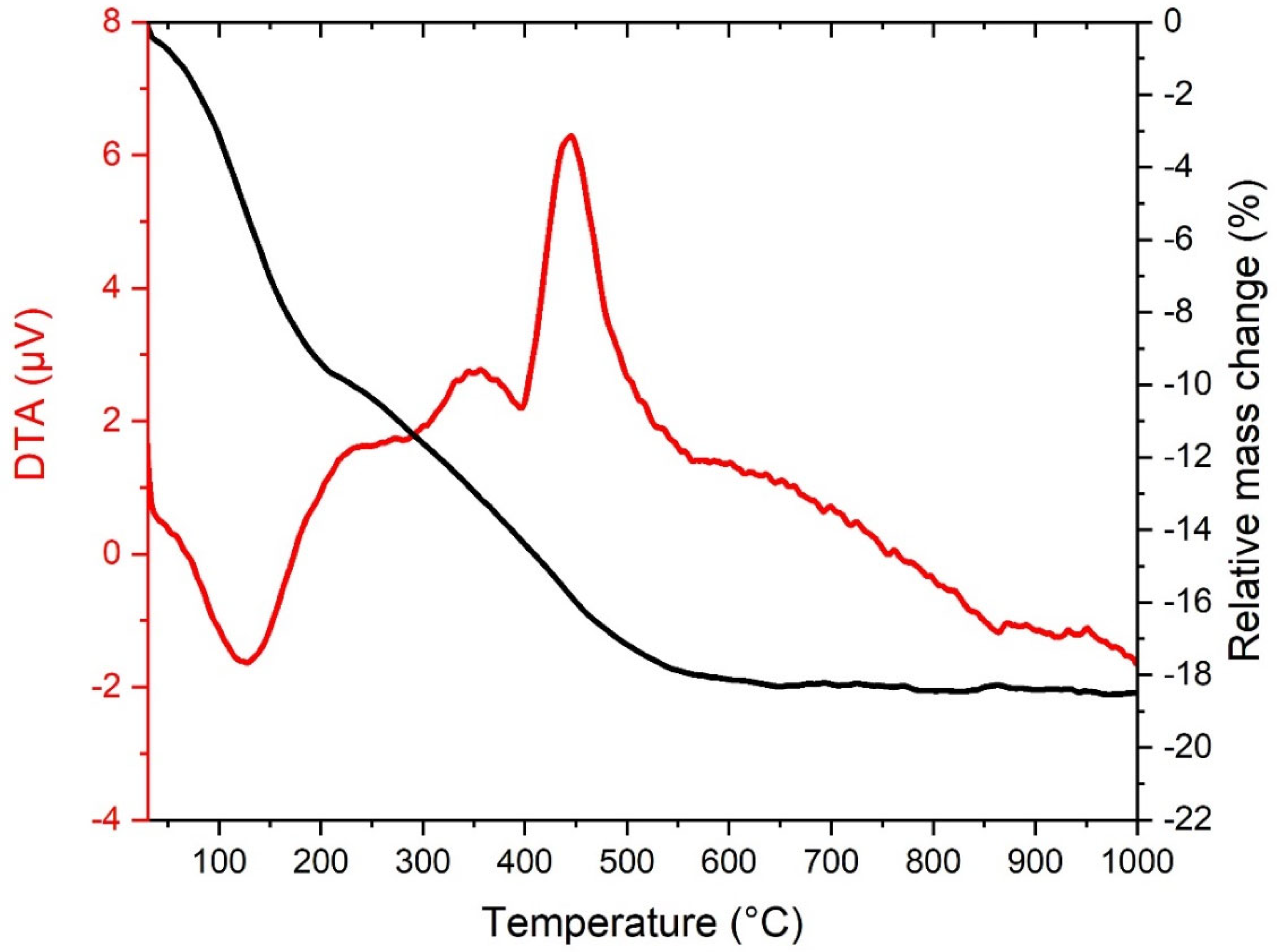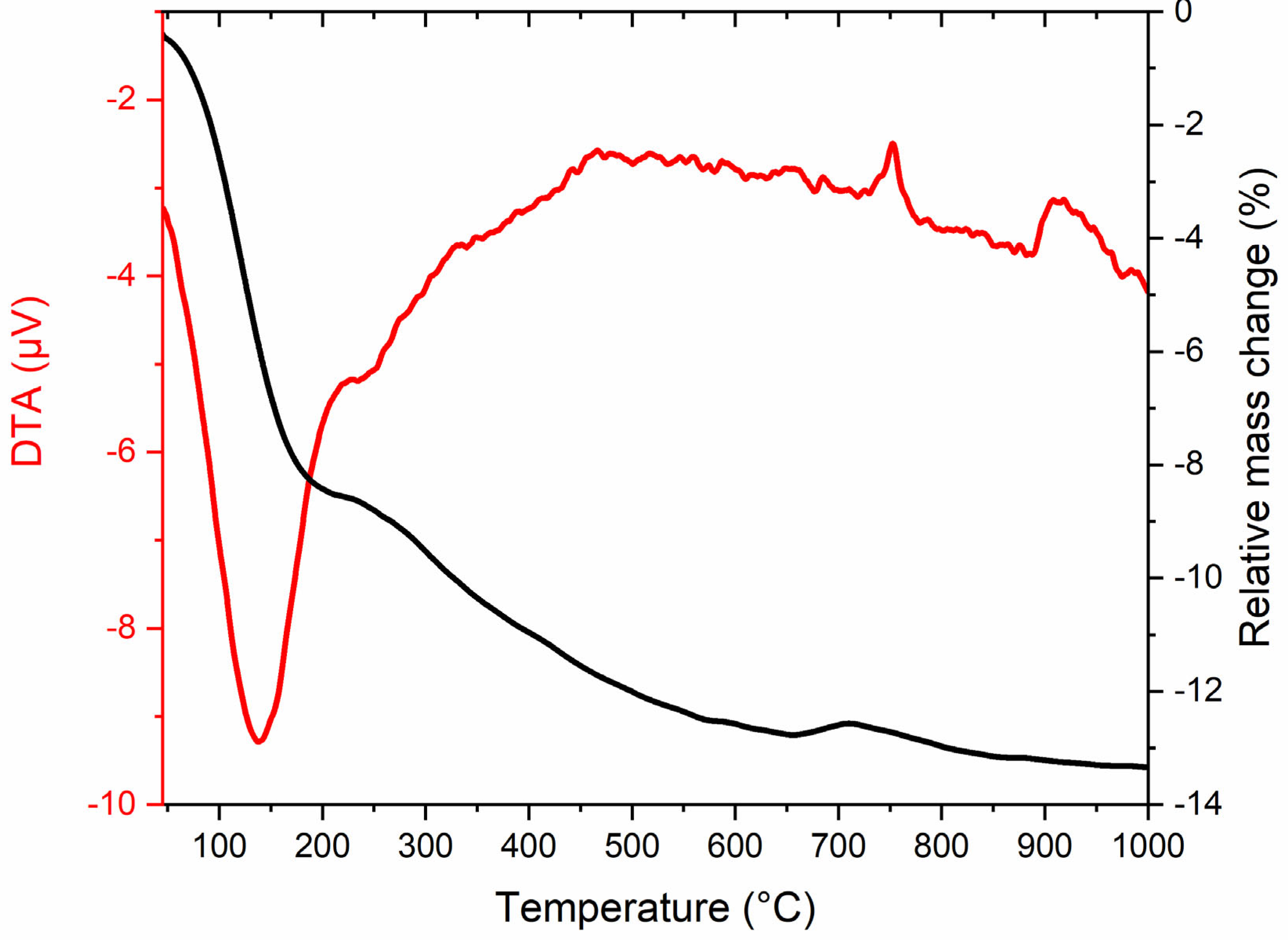 Figure 13 presents the TG-DTA results of NMC-doped TEOS-based fibers, obtained to investigate their thermal stability and decomposition behavior. In this sample, an initial mass loss of approximately 8% was recorded near 200 °C, attributed to the removal of physically adsorbed water, ethanol, and other volatile components. An endothermic peak observed at around 130 °C confirmed this evaporation process. Between 200 and 650 °C, the DTA curve exhibited a broad and irregular exothermic region, corresponding to a mass loss of about 4%. This stage is mainly associated with the decomposition of partially cross-linked silanol groups and residual organic constituents (including TEOS) within the matrix, and may also involve oxidative rearrangements of the Ni, Mn, and Co components in the NMC structure.