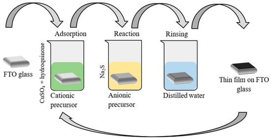 Schematic representation of experimental steps for obtaining CuxS films on FTO glass sheets using the SILAR method.