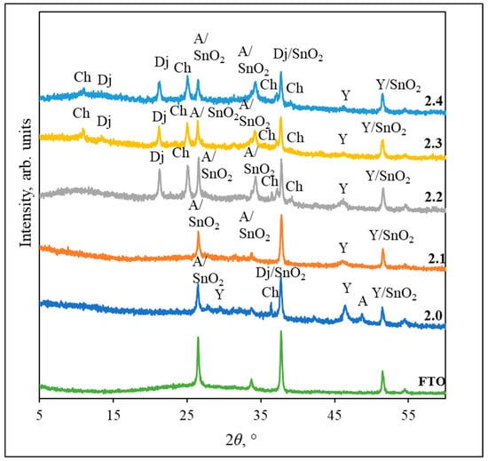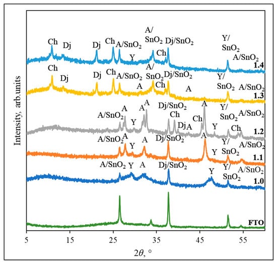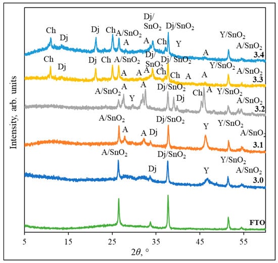 Figure 3, Figure 4 and Figure 5 show the diffractogram of FTO glass, in which five peaks can be seen at 2θ = 26.60; 33.72; 37.86; 51.67; and 54.81°, corresponding to SnO2 (JCPDS PDF no. 46-1088) on the glass surface. The data in Figure 3 represents the results of samples prepared using 0.2 M CuSO4 solution with 0.2 M hydroquinone and 0.2 M Na2S. These conditions facilitate more amorphous films formation (Figure 3, curve 1.0). There are two peaks at 2θ = 26.55 and 32.13° (the interplanar spacings d are 3.3551 and 2.7832 Å), which match to the anilite phase, as well as three peaks with the broadening of the yarrowite phase at 2θ = 29.10, 47.60, and 51.40° (d = 3.0663, 1.9089, and 1.7761 Å). The most intensive peak at 2θ = 37.77° (d = 2.3799 Å) belongs to djurleite, but this peak could also be attributed to the SnO2, which is on top of the glass slide, and to the fact that the background of the FTO mirroring is not masked. Other intensive peaks with a similar situation are at 2θ = 26.55 and 51.40°, where anilite and yarrowite overlap with SnO2.