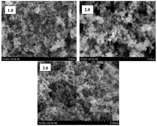 SEM images of as-deposited CuxS film surface; magnification of 10,000×. Precursors: 1.0—0.2 M CuSO4 solution with 0.2 M hydroquinone and 0.2 M Na2S solution; 2.0—0.2 M CuSO4 solution with 0.2 M hydroquinone and 0.1 M Na2S solution; 3.0—0.2 M CuSO4 solution with 0.1 M hydroquinone and 0.2 M Na2S solution.