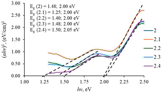 As can be seen from the presented data (Figure 9, Figure 10 and Figure 11), almost all samples contain two band gap values corresponding to copper sulfides and depending on the value of x. Based on XRD analysis, the polycrystalline nature of the copper sulfide film with several copper sulfide phases in the samples was determined; therefore, several values of the band gap energy corresponding to CuxS with different x values were obtained. The band gap value of the as-deposited and annealed at 100 °C samples is close to 2.0 eV, which is consistent with the X-ray diffraction analysis data, since the samples are dominated by CuxS phases with a low x value.