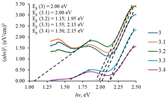 Band gap energies of CuxS films prepared using 0.2 M CuSO4 solution with 0.1 M hydroquinone and 0.2 M Na2S, as-deposited (3.0) and annealed at 100 °C (3.1), 200 °C (3.2), 300 °C (3.3), and 400 °C (3.4).