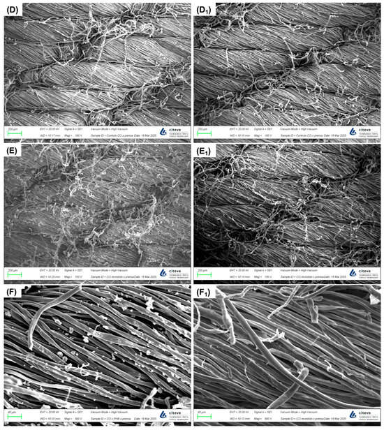 SEM micrographs of PES fabrics (A–C) and CO fabrics (D–F). Images (A1–F1) correspond to the same substrates after undergoing the hot pressing process (180 °C). Images (A,B,D,E) were captured at 100× magnification, while images (C,F) were captured at 500× magnification.