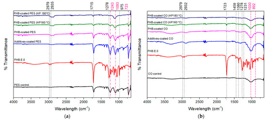 ATR-FTIR characterization of the textile substrates, the PHB.E.0 polymer, and the PHB.E.0-coated substrates, both unpressed and hot pressed (HP) at 160 °C and 180 °C. (a) FTIR spectra related to the modification of PES, and (b) FTIR spectra related to the modification of CO. The black dashed lines indicate bands characteristic of PHB.E.0, observed both in its pure spectrum and in the spectra of the PHB.E.0-coated substrates. In contrast, the pink dashed lines highlight the characteristic bands of each substrate.