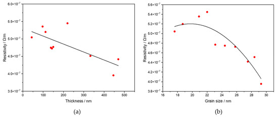 The influence of film thickness and grain size on the resistivity of sputtered gold layers is presented in Figure 8. As shown in Figure 8a, the resistivity decreases linearly with increasing film thickness, dropping from approximately 5.36 × 10−7 Ω/m for 43.7 nm to 3.96 × 10−7 Ω/m for 445.7 nm. This trend is consistent with classical size–effect models, where surface and interface scattering dominate in thin metallic films, leading to increased resistivity for thinner layers [42].