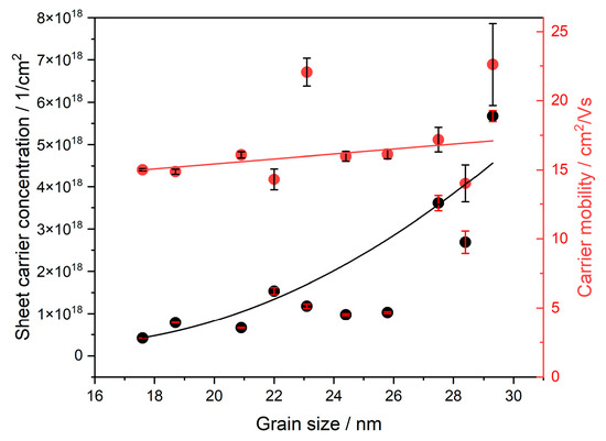 As observed in Figure 9, both the sheet carrier concentration (SCC) and carrier mobility (CM) increase with grain size, consistent with the concurrent decrease in electrical resistivity. The SCC exhibits a near-exponential dependence on the average grain size of gold, increasing from 4.2 × 1017 cm−2, for a sample with an average grain size of 17.6 nm, to 5.7 × 1018 cm−2, for a sample with an average grain size of 29.3 nm. This behavior can be attributed to a reduction in defect density, resulting from the decreased fraction of grain boundaries. Such boundaries often host electron traps, lattice distortions, and other structural imperfections that either localize or scatter charge carriers, thereby lowering the effective SCC. The reduction in the grain-boundary area consequently mitigates carrier trapping and scattering, leading to an overall increase in the measured SCC. The CM also increases with grain size, but much more slowly than SCC. This phenomenon may be caused by the increased electron mean free path, due to fewer grain boundaries (potential barriers) along their paths. The slower increase in the CM compared to the SCC can be explained by the higher density of free electrons in the bulk material (caused by grain size growth), which enhances carrier collisions and leads to a lower-mean free path (and thus lower mobility).