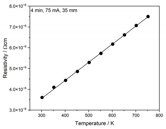 As observed in Figure 10, the resistivity increases linearly with temperature, indicating that in the tested temperature range (300–750 K), processes such as thermal relaxation, recrystallization, or grain-merging did not occur. Because of its manner and very low-value change in gold resistance, it should not have had any influence on the device.