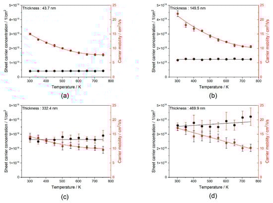 As shown in Figure 11, the sheet carrier concentration in gold thin films with thicknesses of 43.7 nm, 149.5 nm, and 332.4 nm remains nearly constant over the investigated temperature range of 300–750 K. In contrast, the thickest film (469.9 nm) exhibits a slight increase in SCC with a rising temperature. Carrier mobility decreases systematically with temperature for all samples, which can be attributed to enhanced carrier-scattering by phonons at elevated temperatures. The increase in SCC observed for the thickest film may be related to the reduced influence of surface and interface scattering, improved crystalline continuity, and possible thermally induced activation of additional conduction channels within the bulk of the film. These trends are consistent with electron transport in polycrystalline gold, where thinner films are dominated by surface and grain-boundary effects, while thicker films behave more like bulk metal.