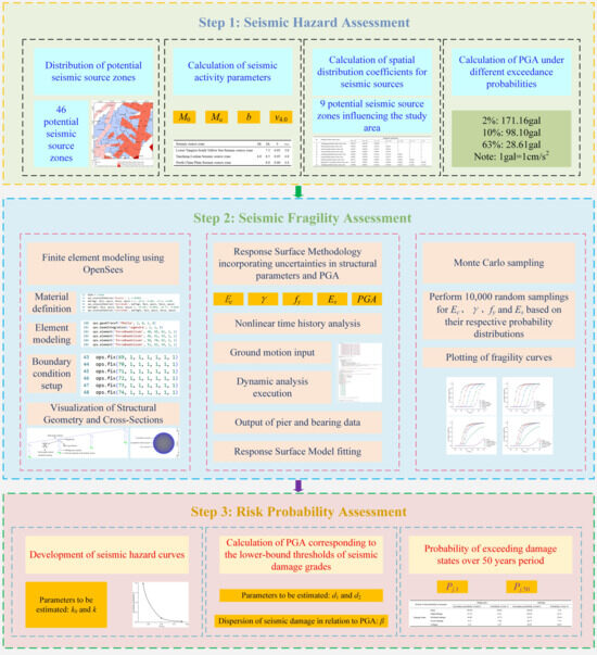 Structural uncertainties are inherent in the design, construction and operation of bridges. A critical technical challenge lies in characterizing the coupled effects of structural parameter and ground motion uncertainties on bridge seismic performance. Although Chinese seismic design philosophy for bridges adheres to the principle of “no damage under minor seismic events, repairable damage under moderate seismic events, and no collapse under major seismic events” [13], clear definitions are lacking for the corresponding seismic intensity indicators (“minor”, “moderate” “major” and damage states (“no damage”, “repairable” “no collapse”); this ambiguity significantly limits the practical application of the philosophy. To address these issues, primary contributions of this study are twofold: (1) to develop an integrated probabilistic framework for bridge seismic risk assessment; (2) to introduce a novel, computationally efficient methodology that integrates the Response Surface Method with Monte Carlo simulation to effectively quantify the coupled effects of structural and ground motion uncertainties. This integrated approach thereby provides a practical and theoretically sound tool for performance-based seismic design and decision-making. The study flowchart is shown in Figure 1.