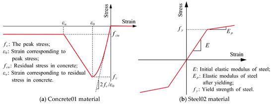 The bridge studied is located in Boshan District, Zibo City, Shandong Province, China, with a span arrangement of 3 × 30 m. The main beam was constructed with C50 concrete (The 28-day compressive strength of the concrete is 50 MPa), while the bridge piers and bent caps were constructed using C40 concrete (the 28-day compressive strength of the concrete is 40 MPa). HRB400 steel (the tensile strength of the reinforcing steel is 400 MPa.) was adopted for reinforcement, and pot rubber bearings were employed as supports. In the finite element modeling using OpenSees (Open System for Earthquake Engineering Simulation), the main beam and bent caps were modeled with elastic beam-column elements, the bearings were simulated using zero-length elements, the bridge piers were represented by force-based beam-column elements with fixed bases at the foundation. Given that the bridge site is characterized by stiff soil (Site Class II), where soil–structure interaction effects are known to be minimal, this fixed-base assumption is considered appropriate, allowing the analysis to focus on the uncertainty and performance of the superstructure components. Concrete in the bridge piers was modeled with the Concrete01 material, and reinforcing steel was characterized by the Steel02 material [14,15,16]. The constitutive relationships of the Concrete01 and Steel02 materials are shown in Figure 2. Figure 2 is cited from the official OpenSees website at: https://opensees.berkeley.edu/ (accessed on 27 April 2024)