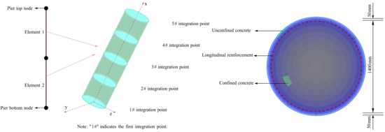The piers were discretized into fiber elements, which were partitioned using Legendre integration. Each element was divided into five integration points along its longitudinal axis, with each integration point having the same cross-section. The five Legendre integration points along the longitudinal direction of the pier and the division of fibers at their cross-sections are shown in Figure 3.